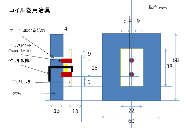 いよいよ製作開始 投稿日: 2016年5月2日 投稿者: sanes-admin 発電機に必要な部品がほぼ揃いました。ここまで購入に要した費用は、約2万円です。 さて、いよいよ製作を開始します。 まずは、コイルの試作をしてみたいと思います。そのためには、エナメル線を巻くための冶具が必要です。前に書いたように、ここでは、本に記載されている三角形ではなく、楕円形のコイルに挑戦します。いろいろ検討した末、とりあえず図に示すような簡単な冶具を作ってみました。木材を2つ使い、その間にφ4㎜のアルミのリベットを挟み込んで、エナメル線を巻いていくしかけです。