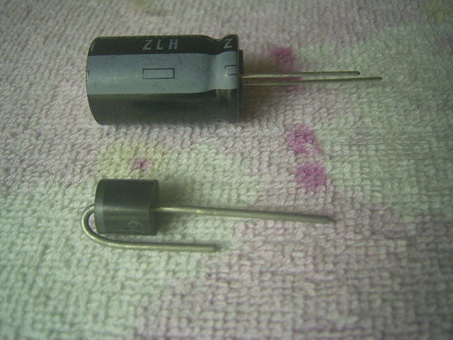 ここで、コンデンサーとダイオードの極性を確認しておきます。これらには極性、すなわちプラス、マイナスがあるので、取り付けには注意が必要です。コンデンサーは買ったときは足の長さが異なっています。足の長い方がプラス側です。本体は全体が黒ですが、マイナス側は灰色に着色されていて、マイナス―の表示があります。足を切ったあとは、これが目印になります。